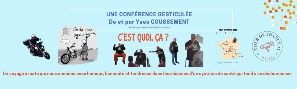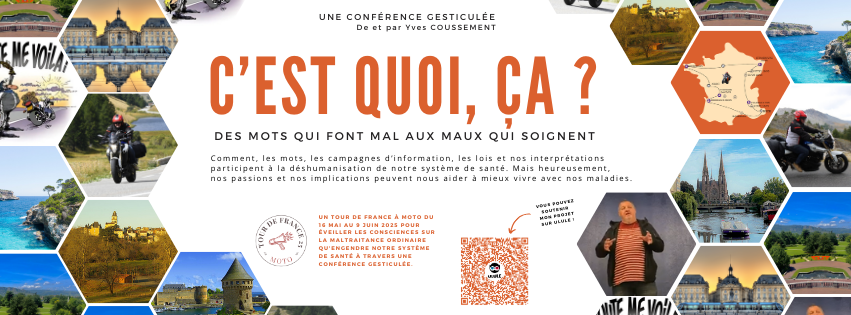 1ère Conférence du tour de France à Moto, avec des soirées conférences gesticulées là ou les salles peuvent m'accueillir. Avec des étapes de 350km maximum. Je pars pour 3 semaines de soins, moto comme thérapie, rencontres et transmissions seront les moteurs de ma rémission.